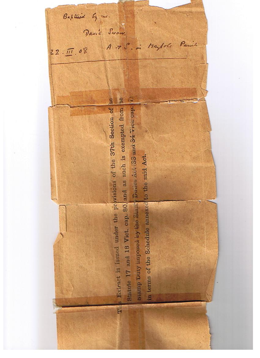 Reverse of Birth Certificate with a notation of Baptism by the Rev. David Swan March 22nd, 1908 |