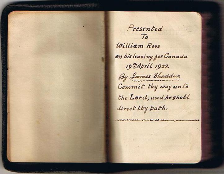 Bible presented to Wm. Ross in Maybole before emigrating to Canada |
