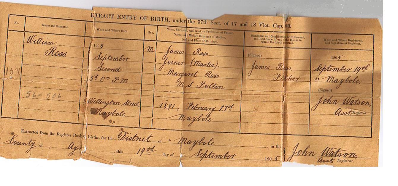 Birth Certificate of William Ross, born Sept. 2nd, 1905 at Maybole |
