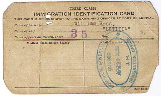 Immigration Records (1925-1935) -------------------------------------------------------------------------------- Surname: Ross Given name: William Age: 22 Sex: M Nationality: Sco Date of arrival: 1928/04/29 (YYYY/MM/DD) Port of arrival: Quebec , Quebec Ship: LETITIA , Anchor Donaldson Reference: RG76 - IMMIGRATION, series C-1-a Volume: 1928 volume 2 Page: 156 Microfilm reel: T-14741 -------------------------------------------------------------------------------- Note: Due to the poor legibility of the original indexes, some information in this database may be incorrect and/or incomplete. Source: FINDI76 - 561236 |