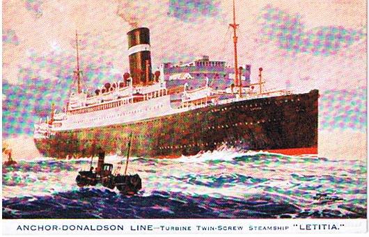 Built as the LETITIA in 1924 by the Fairfield Co, Glasgow for the Donaldson Line of Glasgow. She was a 13,475 gross ton ship, length overall 538ft x beam 66.4ft, one funnel, two masts, twin screw and a speed of 15 knots. There was accommodation for 516-cabin and 1,000-3rd class passengers. |