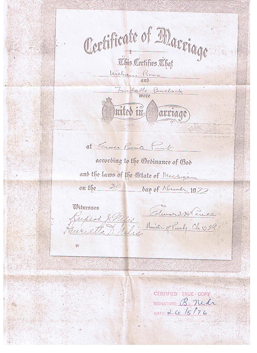 Marriage Certificate of William & Isabel Ross issued at Grosse Pointe Park , Michigan (Detroit) Nov. 30th, 1933 |
