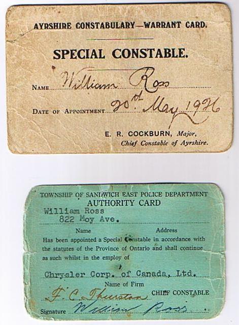 Special Constable Warrant Cards from Ayrshire before emigrating to Canada, and from the old Township of Sandwich East (Now part of Windsor, Ontario), where he was a Captain of Plant Protection. |