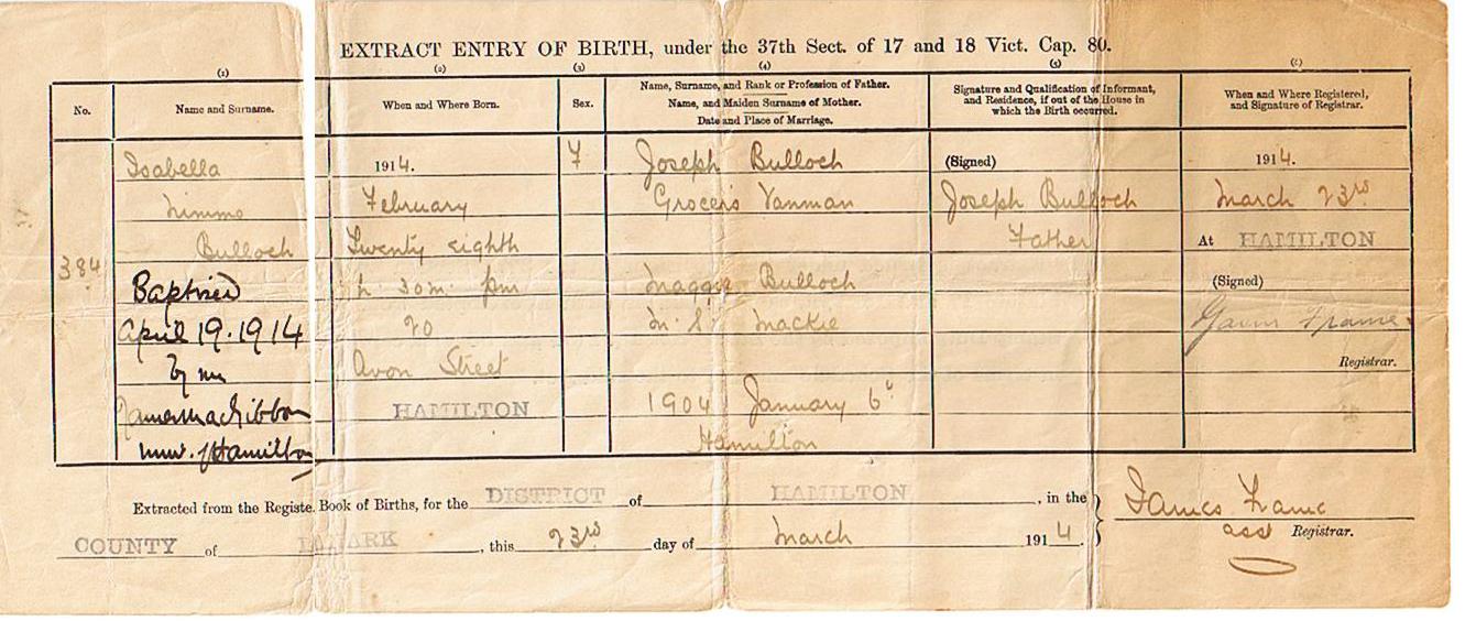 Birth Certificate of Isabella Bulloch, born February 28th, 1914 at Hamilton, Lanarkshire |