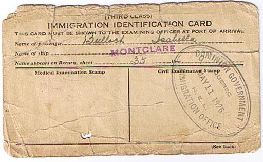 Immigration Records (1925-1935) -------------------------------------------------------------------------------- Surname: Bulloch Given name: Isabella Age: 12 Sex: F Nationality: Sco Date of arrival: 1926/05/10 (YYYY/MM/DD) Port of arrival: Quebec , Quebec Ship: MONTCLARE , Canadian Pacific Reference: RG76 - IMMIGRATION, series Volume: 1926 volume 3 Page: 112 -------------------------------------------------------------------------------- Note: Due to the poor legibility of the original indexes, some information in this database may be incorrect and/or incomplete. Source: FINDI76 - 775122 |